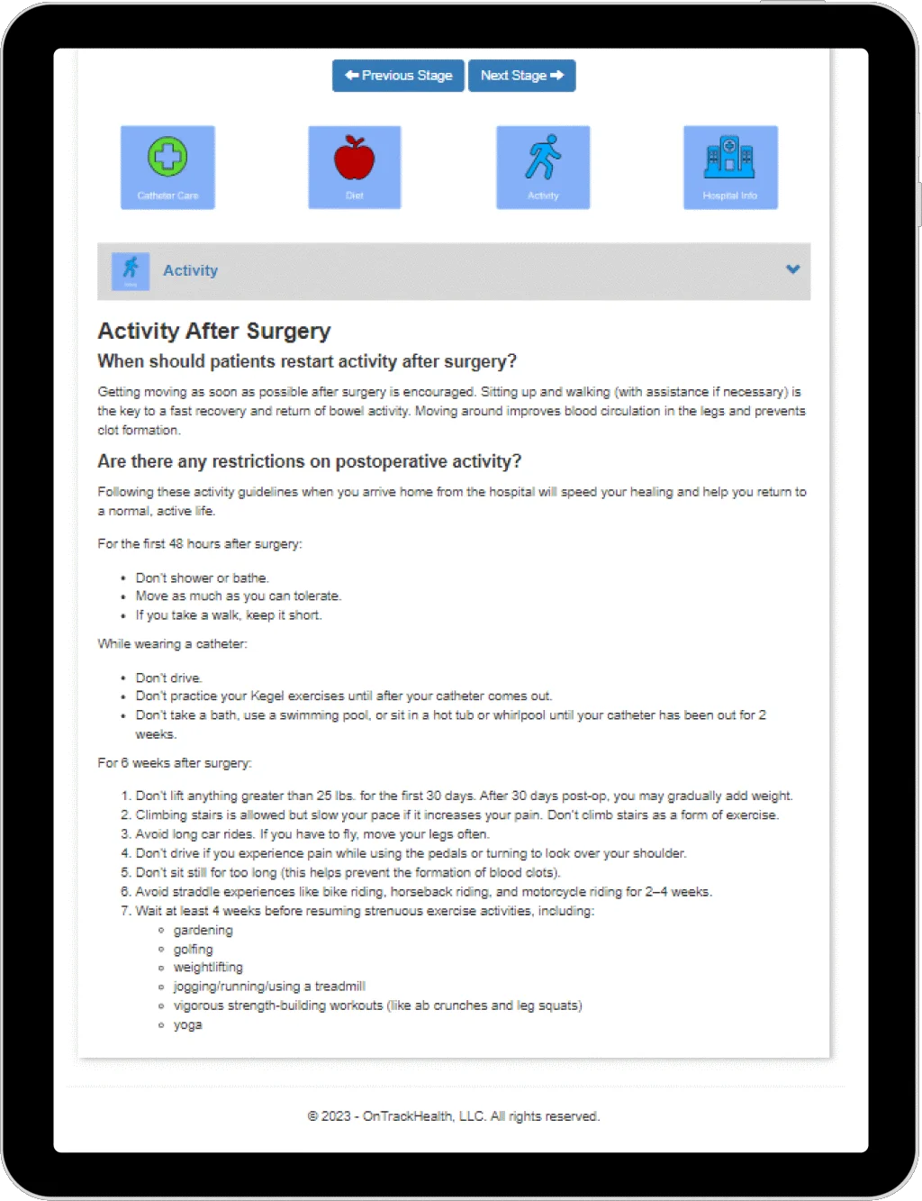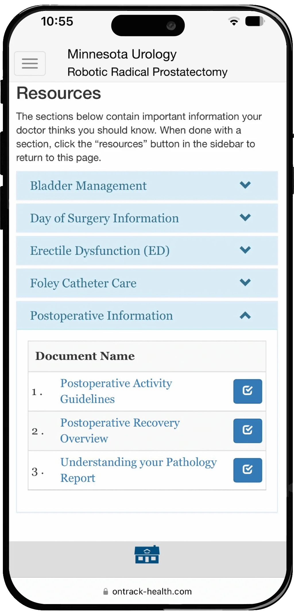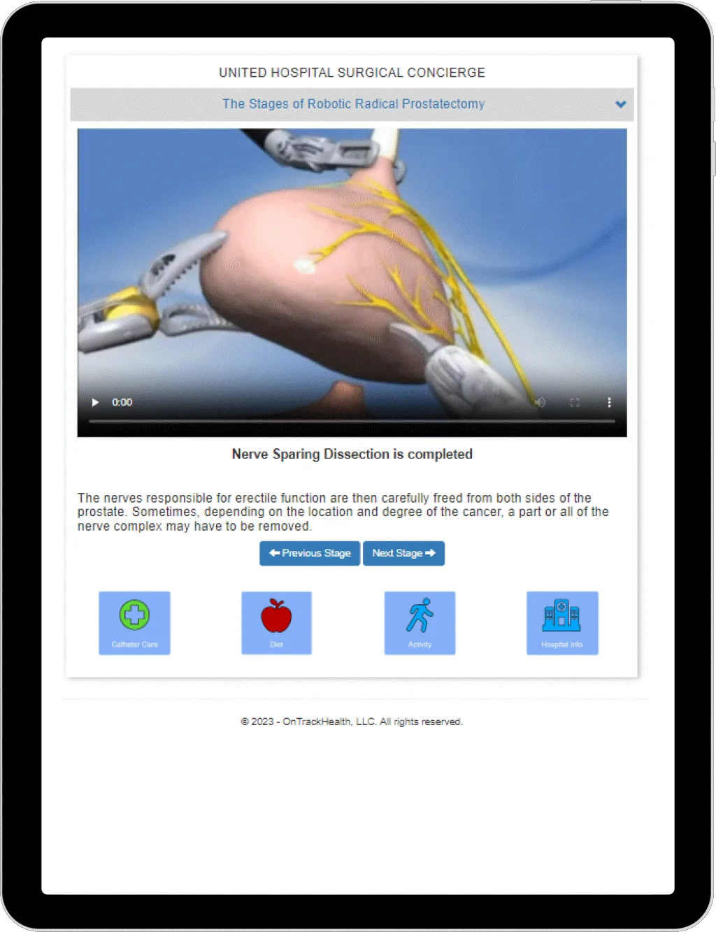 OnTrack-Health™ is a platform that provides patients with timely, specific, and peer-reviewed educational resources. These resources help patients understand and familiarize themselves with the procedure, treatment pathway, and devices that will be used during surgery. All of our materials are peer-reviewed and provided by medical professionals and device manufacturers. There are many internet resources available that are not peer-reviewed, causing confusion. Our educational materials are written by professional technical writers, and they are tailored to specific procedures to provide patients with the information they need. Additionally, there is a patient follow-up portal built into the platform that allows physicians and staff, such as nurses and practice administrators, to follow up with patients as needed.